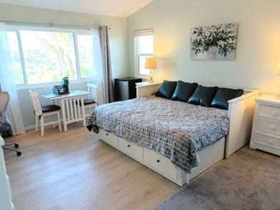 This upstairs, studio-size primary bedroom is 400 sq. ft. (no pets) and offers gorgeous daily sunset views. Rent includes utilities for one person. $300 additional for extra person. Recently remodeled, it features two closets, a small desk with office chair, three small cabinets, 3 lamps, dinette set, artwork, throw rugs, luggage stand, blankets, mini-fridge, microwave, and a Keurig coffee maker for enjoying your morning brew while taking in the surrounding hills. The Ikea Hemmes Bed can be either a California King or Twin size depending on 1-2 people. With a minimum 6-month lease, some furnishings can be removed—just bring your own towels and personal items. Shared spaces include the downstairs kitchen, hallway, living room, entryway, half bath, and backyard, shared with two other people. The kitchen is fully equipped, and there’s a washer and dryer in the garage. Driveway parking is available. Two long-term resident dogs live here, so being comfortable around them is important- no other pets allowed. The minimum lease term is 3 months, Applicants should have good credit, sufficient income, a solid rental history, and no evictions or criminal record, all verified during the application process. Please send a brief profile including your work type, desired move-in date, and contact information.