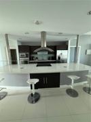 Miami. This residence boasts soaring ceilings and panoramic vistas, encapsulating both the westward shimmer of water against the Miami skyline and the eastern horizon. The