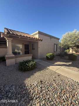 Adorable single level patio home available for immediate move in. Brand new carpet in bedrooms, new blinds throughout. Spacious bedrooms both with walk in closets, two full bathrooms, all appliances included. Community has pool. Super convenient location and excellent school district. Sliding doors lead to patios from the dining and both bedrooms. Storage closet on one of the patios. Two cute private patios and a nice front porch space.