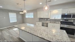 The kitchen and living room are part of an open floor plan concept centered by a large granite kitchen island. The garage is spacious enough to fit 2 cars and the home includes a fenced-in side yard for dogs.