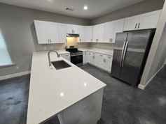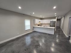 The spacious U-shaped kitchen features abundant cabinet storage, optional bar seating, and excellent flow for cooking and gathering. Throughout the home, sleek grey concrete flooring provides a modern look and low-maintenance practicality, complemented by a neutral color palette that suits any dcor.