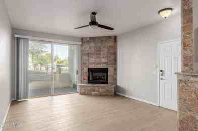 Beautifully updated ground-floor condo in ar gated community. This 1-bedroom, 1-bathroom unit offers a bright and open layout with bright paint, tile and brand new wood-like plank flooring, and plenty of natural light. The kitchen features a breakfast bar that opens to the spacious living room with a cozy fireplace. The primary suite includes a large walk-in closet and a private bathroom with dual sinks. Enjoy Arizona's beautiful weather on your private covered patio with a storage closet. The community offers resort-style amenities including multiple pools and spas, a fitness center, clubhouse, and lush landscaped grounds. Conveniently located near shopping, dining, and quick freeway access to I-17 and Loop 10