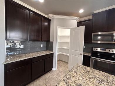 Explore this four-bedroom house located in a desirable neighborhood. The home, adorned with cobblestone and brick, awaits your arrival. Step through the grand entrance into a spacious open-concept living space. The kitchen, ideal for crafting home-cooked meals, features black and stainless steel appliances, including a stove/oven combination, dishwasher, and built-in microwave. A large pantry and an island with a breakfast bar and elegant pendant lighting add to its charm. The living and dining areas offer backyard and covered patio views, enhanced by natural light. The split floor plan affords privacy to the primary suite situated at the rear of the house, equipped with a dual vanity, garden tub, and glass-enclosed shower for ultimate relaxation. The suite's walk-in closet provides direct access to the laundry room, adding convenience. Three more bedrooms and a full bathroom serve additional occupants, and a drop zone helps keep everyday items neatly organized.
