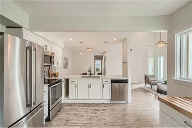 cheery interior, the vaulted ceilings over the living area features a dramatic full height fireplace, and the open concept plan provides a spacious kitchen, dining and living experience. The kitchen features quartz countertops, stainless steel appliances, and ample pantry storage. The large primary bedroom has tall windows, a walk-in closet, and private ensuite bathroom. The oversized 2 car garage has additional storage area and dedicated laundry facilities.