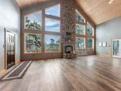 This stunning 3-bedroom, 2 ½ bath custom home sits on 5.28 acres and features an attached four-car garage with a loft. The floor-to-ceiling, river rock fireplace and large view windows fill the living space with natural light. Vaulted knotty pine ceilings, new LVP flooring, and an open-concept kitchen with granite counters, stainless appliances, and a farmhouse copper sink create a cozy vibe. The spacious primary suite is located upstairs with a large walk-in closet and French doors to a private deck-perfect for morning coffee and sunrises. An optional nook outside the primary suite offers flexible space for a home office or reading area. Relax on the covered patio while enjoying gorgeous views.