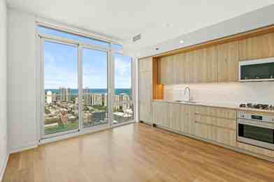 Resort-style amenities include a heated pool, hot tub, sauna, massive terrace, fitness center, basketball court, bowling alley, bocce court, and multiple lounges. The building is pet-friendly, with a pet spa and heated dog run, and is close to Oak Street Beach, Seward Park, and Washington Square Park.
