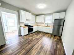 Updated 2 bedroom, 1 bath duplex with a practical layout and a fresh, clean feel throughout. The living room is bright with large windows and durable LVP flooring that runs through the main spaces. The kitchen has white cabinets, butcher block counters, subway tile backsplash, and newer stainless steel appliances including a gas range and full size refrigerator, plus space for a small dining table. Both bedrooms are nicely sized with good closet space. The bathroom is fully renovated with a tub and shower surround, modern fixtures, and a wide vanity for storage. An enclosed entry or mudroom offers laundry hookups and extra storage. Large yard, off street parking, and a convenient location near local shops and services. Parking and access is in the back, garage included in the rent!