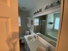 It has 3 bedrooms, each with their own closet, 2 full bathrooms upstairs and half a bath downstairs. The house is fully furnished, kitchen is fully stocked and it has washer, dryer, dishwasher, stove, microwave, fridge.