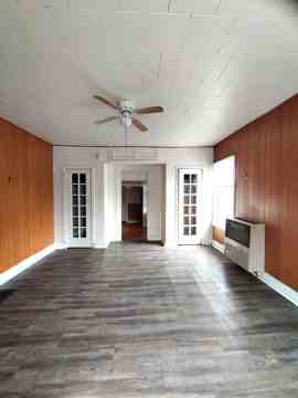 Upper South apt includes all utilities; Large kitchen and living room, small bedroom with big closet, bedroom and kitchen have laminate flooring. Fixed cat only with extra rent and pet deposit. 4 unit building. Close to town.