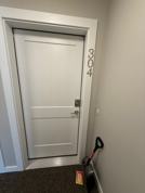 The half bath is off the kitchen and hold the in unit stacked washer and dryer.