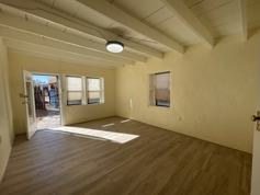 Welcome to this charming 1 bedroom, 1 bath adobe home showcasing classic Santa Fe style, offering comfort, character, and convenient parking. The home features updated laminate flooring throughout, complemented by durable tile flooring in the kitchen, utility room, and bathroom. The generously sized kitchen includes built-in shelving for added storage and organization, along with a convenient side entrance—perfect for easy access and everyday living.