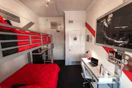 Starting at $745/month, our double rooms are the best option for those who want more room and fewer people. This room accommodates two guests. The room comes with a sink/mini-fridge, chair/desk workspace with charging station, locker & closet space, bedside reading lamp and charging station, and free wifi. All utilities included.