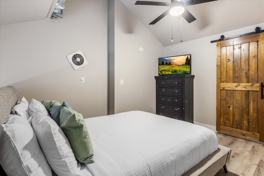 Indoor Living: Smart TV with streaming apps, ceiling fans, and games.