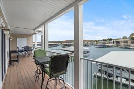 Outdoor Living: Private lakeside deck with seating and boat slip for guest use.