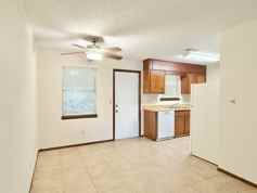 The galley-style kitchen offers a dual-basin sink overlooking the backyard, along with a standard refrigerator, flat-top range/oven, and dishwasher. The bathroom includes a single vanity and convenient tub/shower combo.