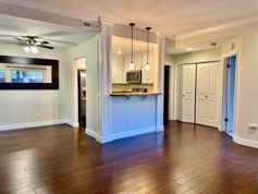 Beautiful kitchen, dining and living room. Stainless steel appliances, Modern fridge, granite countertops.