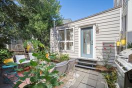 The layout features a convenient bathroom on each floor. Step outside to enjoy two expansive Charleston-style porches, ideal for relaxing or entertaining. The quaint backyard feels like a private oasis, with a peaceful pathway, lush garden, and mature trees that create a serene, natural setting.