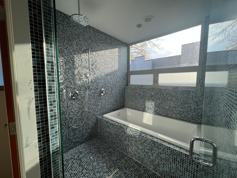 • Designer kitchen with custom countertops, stainless steel appliances, and custom tile backsplash