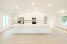 Step inside to a bright interior featuring neutral tones, contemporary finishes, and wood-look tile flooring throughout. The expansive kitchen showcases white shaker cabinetry, quartz countertops, a massive center island, stainless-steel appliances, and premium lighting—perfect for entertaining or everyday convenience.