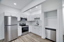• Modern kitchen with quartz countertops and stainless steel appliances