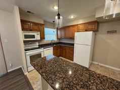 •Main Level: Step into a large open-concept living and dining area featuring durable vinyl flooring. The kitchen is equipped with granite countertops, a breakfast bar, wooden cabinetry with ample storage, and electric appliances. Off the dining room, you'll find a screened-in deck—perfect for entertaining or relaxing after a long day. The fenced backyard also includes secure storage.