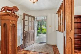 Step into timeless charm with this Tudor-style 4-5 BR, 2.5BA home, perfectly positioned on a spacious lot that backs up to a serene wooded stream. The home's warmth shines through with rich wood beams, custom woodwork, and hand-crafted bookshelves nestled in the cozy upstairs loft. Enjoy the peaceful views from the deck, accessed through elegant French doors off the living space. The remodeled kitchen is a chef's dream, featuring quartz countertops, a statement stainless steel hood, and a large sink framed by a window overlooking nature. The primary suite is a true retreat—set apart from the other bedrooms for privacy—with its own French doors opening to a private balcony, double vanities, barn doors, and a luxurious rain shower in the ensuite bath. From the lofty ceilings to the tranquil outdoor setting, this home offers character, craftsmanship, and comfort in every corner.