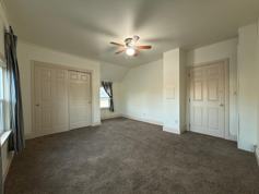 - Spacious Bedrooms: Two comfortable bedrooms featuring plush neutral carpeting and generous closet space with built-in shelving. The larger primary bedroom includes a ceiling fan for year-round airflow.