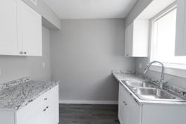 Lovely 2 Bedroom apartment featuring a spacious kitchen with stainless steel appliances, bright cabinets, new countertops, plank flooring, and new bathroom vanities and light fixtures.