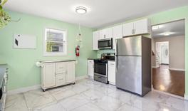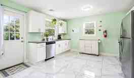 Modern kitchen with updated stainless steel appliances. Washer dryer in laundry room. Bright and airy