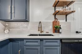 The updated kitchen boasts stainless steel appliances, quartz countertops, and ample cabinetry for storage.