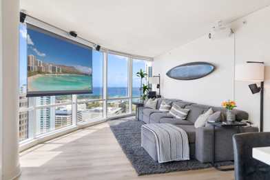 3-bedroom, 2-bathroom condominium, perfectly situated near the vibrant Kakaako neighborhood, Ala Moana Beach Park, and Ala Moana Shopping Center. This spacious unit features floor-to-ceiling windows that capture spectacular Ocean, Mountain, and City views, providing a bright and airy atmosphere.