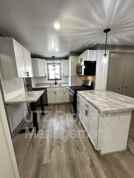 This one-bedroom apartment has been beautifully renovated with contemporary finishes and a palette of neutral tones throughout. The living room features vibrant stained glass upper windows, lending a touch of historic charm. The kitchen is equipped with sleek white cabinets, stainless steel appliances, and ample space for a dining area. The bedroom offers a huge walk-in closet area. Additional conveniences include a full-sized washer and dryer in the unit, along with a large off-street parking pad.