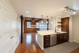 Step into this inviting one-bedroom den loft and enjoy a seamless mix of character and comfort. The soaring wood-beamed ceilings and exposed brick instantly set a warm, urban tone, while oversized mill-style windows fill the space with natural light and highlight the hardwood floors throughout the open living and dining area. The kitchen has been thoughtfully updated with quartz counters, stainless steel appliances, and a generous peninsula that works well for everyday meals or hosting friends. Just off the main living space, the spacious bedroom offers high ceilings and great storage, and the full bath has been refreshed with clean, modern finishes. Residents also have access to a rooftop deck, patio, fitness center, and business lounge, ideal for relaxing, working, or staying active. A loft for anyone who values charm paired with convenience.