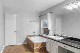 Rare find – 1-story, 5 bedroom home! Move-in ready! Packed with updates including recent PEX plumbing, new gas range/convection oven, interior paint, fencing, fans & more! Bright, open layout with vaulted ceilings and gas-log fireplace. Kitchen features granite counters, white cabinetry, tile floors & stainless refrigerator included! Spacious primary suite with high ceilings, granite dual vanity, jetted tub & remodeled shower. Enjoy the elevated deck with pergola, new back fence & no rear neighbors! Washer, dryer & sprinkler system included. Don’t miss this one!