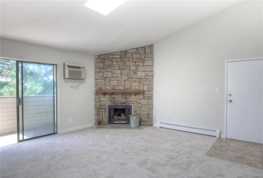 Second-floor end unit which is bright, open floor plan with oversized wrap-around windows, wood-burning fireplace, updated kitchen featuring stainless steel appliances and granite-look counters, full-size in-unit washer/dryer, A/C, and private covered balcony with mountain views from living room and primary bedroom.