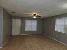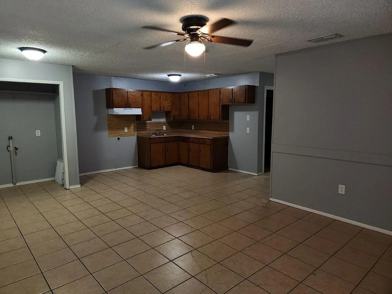 This property at 102 San Diego St features a charming exterior with light olive-brown siding, white-trimmed windows, and a narrow concrete walkway alongside a wood fence. Inside, the open-concept living area and kitchen offer tan ceramic tile flooring and dark charcoal gray walls. The kitchen has dark wooden cabinets, matching countertops, and ceiling fans in both the kitchen and living areas. Bedrooms continue the tile flooring with contrasting wall colors—one dark gray, one pale gray—and ceiling fans with light fixtures. The bathroom includes a white vanity, sink, toilet, and coordinating tile flooring. White trim throughout provides a clean look, and a utility/storage area adds practicality. -Thanksgiving Promo: Get 1 Month FREE! Enjoy 50% off your 1st month and 50% off your 2nd month’s rent. Limited-time offer for approved applicants. -What We Check: No credit check required! Only a general background & criminal check is run. Your credit score will not affect your application.