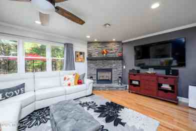 Stunning home with a touch of elegance and special upgrades. Hardwood floors carry t/o the main living areas as do recessed lighting and crown mouldings. The kitchen has beautiful, soft close cabinetry and gleaming quartz counters, a slide in stove & reverse osmosis water filter - open to the living & dining rooms for easy conversing. The floor to ceiling stone fireplace adds character, warmth and ambiance. Off the living area are French doors leading to a private room perfect for den, office, hobby or guest room. Custom closets for organization. Bathrooms tastefully upgraded. Separate laundry. Garage + a double wide driveway. Large rear patio area for dining outdoors and a place to relax and appreciate the tranquil, scenic woods that change with the seasons. Patio is fenced.