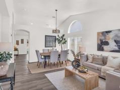 Vibrant landscaping welcomes you inside, where vaulted ceilings, warm wood-style flooring, and abundant natural light create an inviting atmosphere. Plantation shutters, graceful archways, and an open-concept living and dining area enhance the home's timeless appeal. A cozy family area features a striking fireplace and sliding glass doors that open to a covered patio perfect for weekend BBQs and relaxed outdoor living.