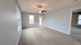 3079 Flintlock Dr is a great 3 bedroom, 2 bath patio home located in the quiet Springfield neighborhood just off Blue Angel Parkway; minutes from the Navy Federal campus with quick access to I-10 and Pensacola NAS. The main living spaces are filled with natural light and include updated LVP wood-look flooring, neutral wall colors, and thoughtfully chosen fixtures that create a clean, modern feel throughout. The kitchen and dining area serve as the heart of the home, with a spacious layout that includes ample cabinetry, stainless appliances, and a large breakfast bar perfect for casual meals or entertaining. The adjoining dining space flows easily into the living room, making the home feel open and connected while still offering cozy spaces for everyday living. Both bathrooms are tastefully updated, featuring modern lighting, vanity mirrors with rustic framing, and clean finishes that feel fresh and contemporary. The primary bathroom includes a dual-sink vanity and plenty of storage, creating a comfortable and functional space. Additional bedrooms are well-sized and full of character with carpet in each Outside, the fully fenced backyard is ready for relaxation and gatherings. A beautiful elevated deck offers the perfect space for outdoor dining, grilling, or unwinding while overlooking the yard. There is also a fire-pit area and plenty of room for pets or play. This property requires participation in the MSPM Resident Benefit Package for an additional monthly fee. Additional information on this program can be found upon submission of application.