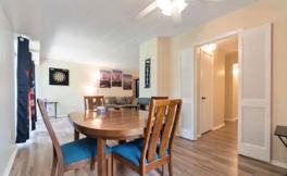 spacious ground-level 1b/1b unitoffers 927 sq. ft. of comfortable living. The open layout features a welcoming foyer, a large living room with a wood-burning fireplace, hard flooring, and a separate dining area that connects to a bright, table-space kitchen. Enjoy in-unit laundry, a large primary bedroom filled with natural light, and a well-maintained full bath. Sliding doors open to a private patio overlooking mature trees and green space. The home includes an assigned covered parking space, and the HOA covers water, sewer, exterior maintenance, landscaping, and snow removal.