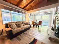 Spacious and versatile, this 4-bedroom, 3-bath home offers 1,672 square feet of comfortable living in a flexible layout perfect for families or entertaining guests. The main level features two bedrooms and two bathrooms, complemented by brand new laminate flooring and a welcoming corner fireplace that anchors the living area. Upstairs, you'll find two additional bedrooms and a full bath, with access to an upper deck-complete with a spiral staircase leading to the fenced backyard. Enjoy a circular driveway, ample storage with a dedicated shed, and the option to have the home furnished or unfurnished to suit your needs. The backyard and entertainment spaces make this property ideal for gatherings, relaxation, and enjoying the mountain lifestyle. Laundry is conveniently located inside. This home blends practicality, comfort, and charm in every detail.