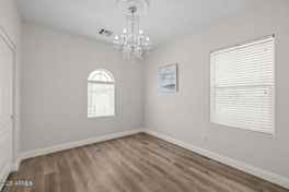 Gorgeous 3 bedroom 3 bath home in Mesa gated community! Step into the grand entryway and into the living room that boasts soaring 20 ft ceiings. Home exudes style and elegance. Plenty of natural light throughout. Luxury plank vinyl throughout. Spacious kitchen has plenty of counter space. Guest bedroom downstairs has a full bath. Primary suite has a balcony, walk in closet, and separate toilet room. All bathrooms have been renovated with walk in showers and quartz countertops. Oversized backyard is a great for BBQs and gatherings with extended patio and a heated pool/spa Detached 2-car garage has plenty of cabinets and epoxy flooring. Extended paver driveway provides parking for up to eight vehicles. Community offers heated pool, playground, sports court and large greenbelt. Minutes to Minutes to I-60 and Loop 202 freeway. Close to shopping, dining and schools.