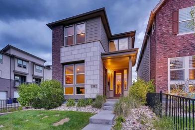 The kitchen includes a large quartz island, stainless steel appliances, and a gas stove. Upstairs, there is a double-sided fireplace, spa-like primary bath with soaking tub. Finished downstairs level includes one bedroom and full bath, entertainment area and kitchenette. Private outdoor space includes a built-in grill. Two-car garage and easy access to I-25 and nearby light rail stations.