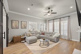 A set of custom barn doors leads to a private office and/or flex space, perfect for today's work-from-home lifestyle or a quiet study space. The chef-inspired kitchen features a large center island, an additional walk-in pantry, and an open layout ideal for both cooking and entertaining.