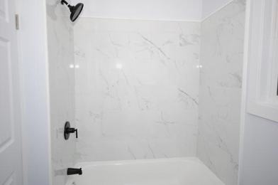 4. Completely remodeled bathroom with tiled bath and contemporary fixtures.