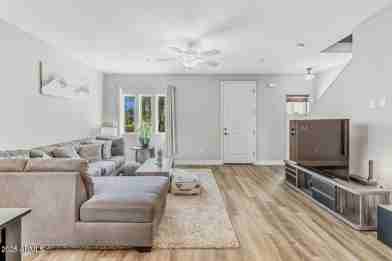 Built in 2017, this modern townhome at features two spacious primary suites, each with a private bath and roomy closets, plus a guest bath on the main level. The open great room offers wood-look flooring and abundant natural light, flowing into a contemporary kitchen with quartz countertops, stainless steel appliances, a breakfast bar with pendant lighting, and ample cabinetry. Upstairs laundry and an attached 2-car garage add everyday convenience. Outdoor spaces include a front patio and a private balcony off the main primary suite. Residents enjoy community amenities including a heated pool and spa, playground, BBQ ramada, greenbelt walking paths, and gated access. Easy access to the 202 and 60 freeways, with nearby shopping, dining, and entertainment options.