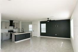 Step into an inviting open-concept living space featuring tile flooring on the main level and upgraded pet-grade laminate upstairs. The gourmet kitchen shines with stainless steel appliances, granite countertops, a custom tile backsplash, a black ceramic sink, solid wood shelving in the walk-in pantry, and an upgraded range hood—perfect for everyday living and entertaining alike.