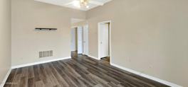 Great rental home MOVE-IN READY features an open floor plan with wood flooring throughout. The large family-sized living room flows into the spacious kitchen with breakfast area, stainless steel appliances and tons of cabinet space. On one side of the home is the primary suite with private full bath & walk-in closet. One the other side of this home is a spacious 2nd bedroom with a nearby bath. The open patio overlooks the large backyard with wood privacy fence.