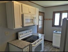 Kitchen with new white cabinets and Granite counter-tops. Stove, refrigerator and microwave included. Dining room and family room downstairs; Two bedrooms upstairs. First bedroom has a large walk-in closet; second bedroom has standard closet. Updated bathroom. Full basement with washer and dryer hook-up. Two-car garage; one space for each tenant