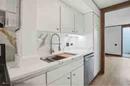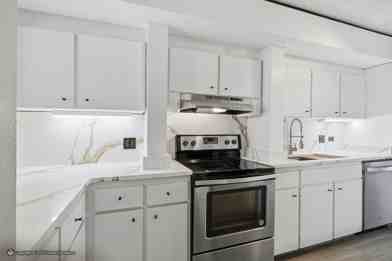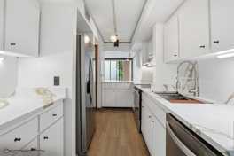 The newly updated kitchen features new cabinets, countertops, sink fixture and stainless-steel appliance package.